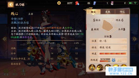 加点推荐: 加点的话一般是推荐主二技能噬魔,副一技能残心。但是也有特殊情况可以主1技能。比如上单妖刀姬如果遇到像吸血姬这一类手比较长。比较难打的上单时。是可以考虑主一技能进行中后期发力的。因为升级一技能。回血效果会增加的比较显著。