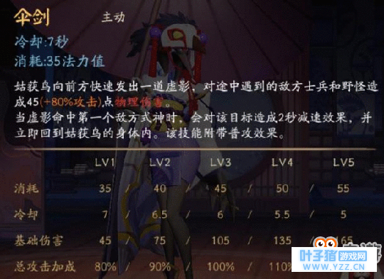 A输出 :4个技能中3个与输出有关,管够。 B控制 :仅有一个减速输出二合一的技能:【伞剑】。 B生存 :满级10秒CD(装备成型后仅需6秒)的位移【羽衣夜袭】。划重点,大招【天翔鹤斩】释放期间姑获鸟处于无敌状态,躲控,拖CD皆可,不仅如此,还顺带位移效果。大大提升了我们的生存能力。所以我个人认为,姑获鸟的生存说是A也不为过! 其余评级选项并不重要,在此一并略过。 总结: 能打,可秀! 下面说一些我个人对姑获鸟的使用心得和思路以及小技巧。 出装的主要思路: 由于姑获鸟的所有主动技能均伤害不俗,以及其并没有站撸方面的先天优势,所以选择以技能伤害为主的出装。