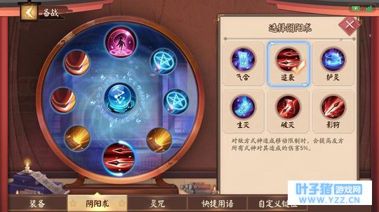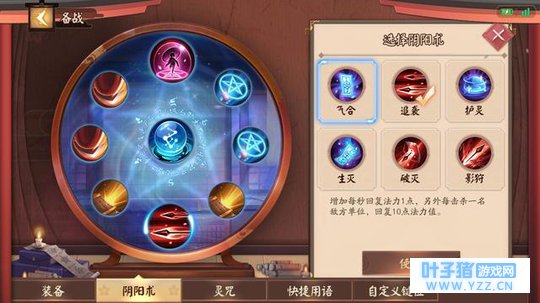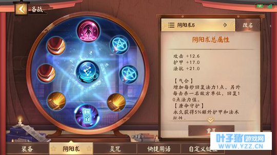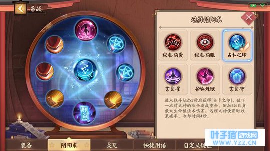 三、阴阳术搭配 由于鸦天狗的定位是坦克,所以在阴阳术的选择上也比较固定,并没有什么太多可以选择的空间,因此阴阳术的选择是: 【占卜之印、唐伞守护、气合 (追袭) 、物攻*2、护甲*2、法抗*2】