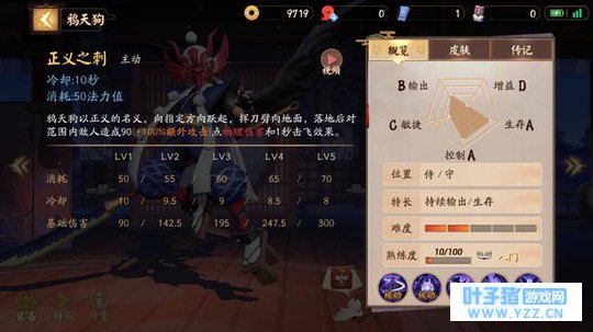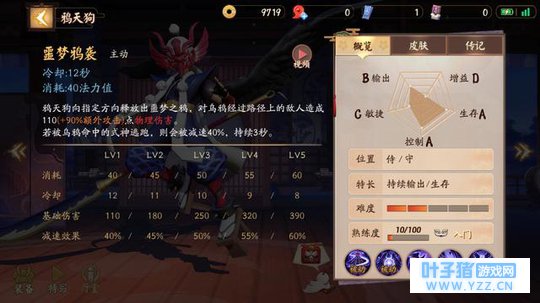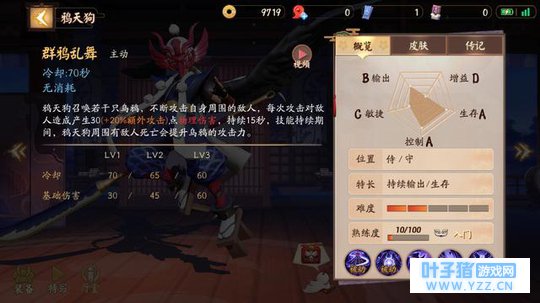 终极技能:群鸦乱舞 效果: 鸦天狗召唤若干只乌鸦,不断攻击自身周围的敌人,每次攻击对敌人造成产生30(+20%额外攻击)点物理伤害,持续15秒,技能持续期间,鸦天狗周围有敌人死亡会提升乌鸦的攻击力。