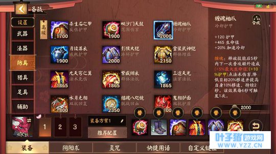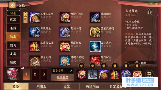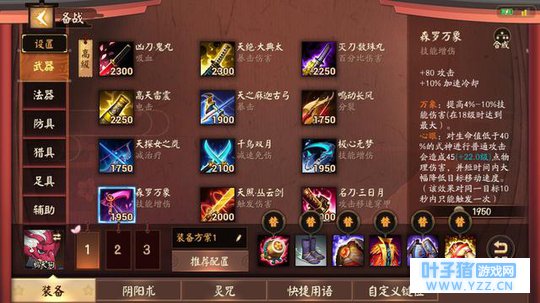 四、装备搭配 在装备的搭配上,由于鸦天狗是一个坦克式神,因此在装备的选择上需要根据对方的阵容来决定,但是系统推荐的装备就挺不错的了,可以应付绝大多数的情况,这里就为大家推荐几个可以提供替换的装备: 【缠魂袖爪、森罗万象or极心无梦、三途天光 】