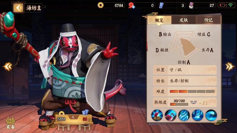 海坊主这个胖子,一看就是做坦克的命。作为一个防守后制型辅助,前期会在对线上少许的吃力,而他的技能耗蓝也比较快,前期很难去和敌方式神打消耗。玩海坊主需要学会把握时机,说白了就是要学会抓住时机搞偷袭。海坊主一技能作为一个回血加抗性的技能,在团战和对线上均可以为自身提供续航能力。对于海坊主这个胖子来说,配上这个恢复技能,在后期就能肉成一块铁,打起架来全靠刚,一口奶就是成百的血量。而其二技能的击飞效果让其可攻可守,但是不建议用来消耗,耗蓝太快。最后大招这个三重海浪,属于强控技能,作用效果的范围极大,是个开团神技,但建议后手开打,虽然推人的方向可以随意操作,但如果先手,别人早有防备可能难以有什么效果。 TOP4 青行灯
