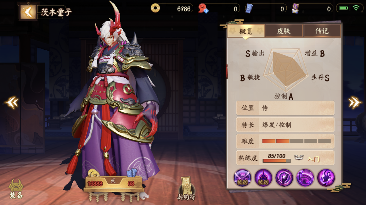 茨木童子作为《决战!平安京》中最昂贵的侍类式神,其造型与技能特效十分酷炫。茨木童子在日本有着“罗生门之鬼”的名号,是日本著名妖怪酒吞童子的部下。在游戏里,茨木童子的能为无愧于“罗生门之鬼”之名。他像是从地狱中带着疾风来的,甫一惊觉便被他带入了黑暗的鬼域之中,随后从地狱里伸出来的一双巨大黑手将敌手直接攥于掌心之中。随即,就是湮灭。这就是茨木童子在游戏中的战斗风格。 式神定位: 茨木童子在游戏中给出的定位是侍。但是他有却着出人意料的爆发力。茨木童子是所有射类与巫类式神的噩梦。通过一技能的位移打出短暂的控制效果,随后便开启范围性的二技能贴身作战。待二技能结束后,再开启三技能(大招)。一场战斗就此画下了句号。