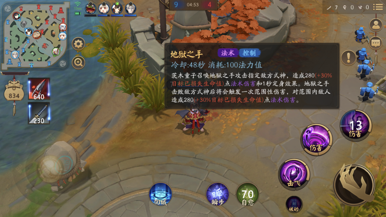 地狱之手(三技能):茨木童子召唤地狱之手攻击指定敌方式神,造成280(+30%目标已损失生命值)点法术伤害和1秒定身效果。地狱之手击败敌方式神之后将会触发一次范围性伤害,对范围内敌人造成280(+30%目标已损失生命值)点法术伤害。该技能每级增长260点基础伤害和5%生命值百分比。 冷却:60秒 消耗:100法力值 解析:该技能在任何MOBA手游里都能算得上是顶级技能。任何拥有该类似技能的英雄都会是热门。该技能在游戏中满级后800(+40%已损失生命值)的法术伤害是任何残血式神的噩梦。我初略算了一下配合上破灭的阴阳术。当总血量低于30%时,受到该技能伤害后的存活率基本为0。 小技巧: 1. 该技能可以通过出极心无梦或森罗万象这类装备来将技能伤害发挥到最大。算上10%技能伤害的加成,敌方式神在生命值总量低于35%时就有了致命的危险。 2. 该技能成功击杀对方式神后的范围性伤害在团战中有着一定的作用。选择好技能释放的时机相当重要。当对方式神大多是残血状态时,地狱之手会将他们一同带入地狱。 3. 该技能并不是瞬发,施法有一定的延迟。控制效果也是差强人意,所以茨木童子千万别当控制效果来打。另外在逃生时该技能的控制使用可以尝试用一下。或许能够提高你的逃生率。 4. 受限于式神性质,该技能的范围也是很有限。大多靠一技能突进得以释放。另外在追残血时,可以用能用1技能+瞬步突进的方法来释放技能。