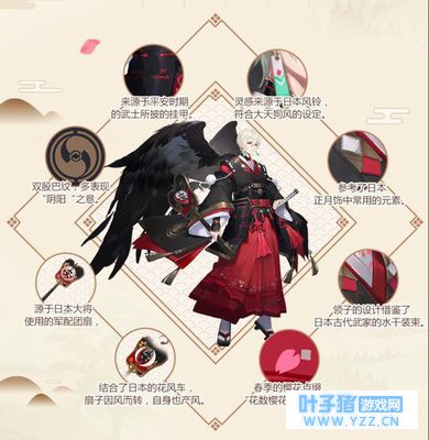 大天狗着一身肃穆黑衣,这身精致的服装改良于水干,乃平安时期公家与武家的日常装束。他微微扬起下巴,露出兴致勃勃的眼神,正如这被烟火妆点的庆典夜空,深邃而又灿烂。 领口处绣有樱花,谚语有云,“花数樱花,人数武士”,意为百花中樱花最美丽,而万千人群里也只有武士的精神最值得为人称道。衣袖的下摆上和腰间多处,由双股巴纹作为点缀。“巴“是日本传统文化中常出现的一种图案,而双股巴纹则多表示”阴阳“、”闪电“的意思。经过变形后的双股巴纹多了中心的”暴风眼“,彷如大天狗对风强大的驾驭能力。 腰间两侧铁黑挂甲则是源于平安武士们所披的挂甲,层层叠叠的甲片由红色绳索串连起来,勾勒出大天狗挺立的身姿。望着夜空中不断升起的绚丽烟火,大天狗微微一笑,向着热闹的街市走去,这场庆典之夜,又会遇到怎样有趣的人呢?