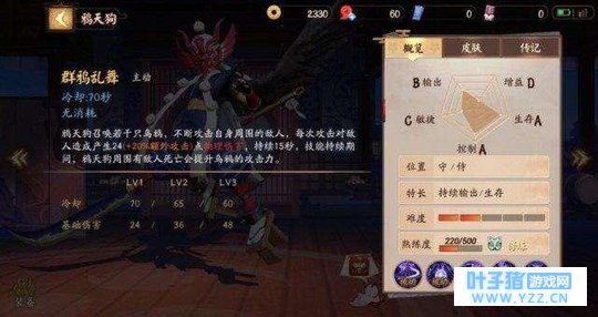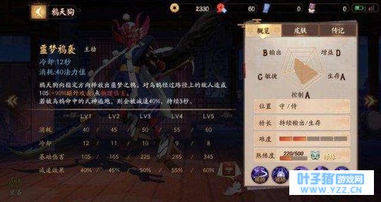 一技能是鸦天狗主要的抗压技能可以更好的赖线和抗伤害,并减少自己被射手和战士的输出