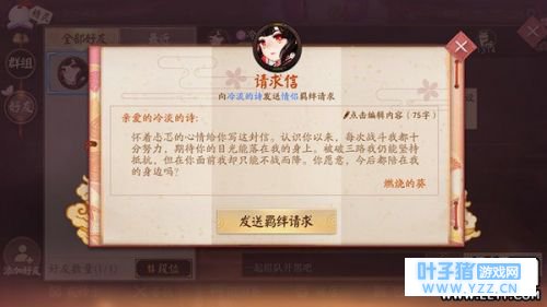 在建立羁绊时,需要由一方发起申请才可执行,若收到申请的好友如果在线且不在战斗或匹配中,则在他同意后即可达成羁绊关系,而达成关系的这一天也将成为你们的纪念日。 值得一提的是,在申请时,内务组已经为大人们准备了想给好友说的肺腑之言,但大人们完全可以自行编辑,想必由大人们亲手书写的信件更能给好友带来感动。