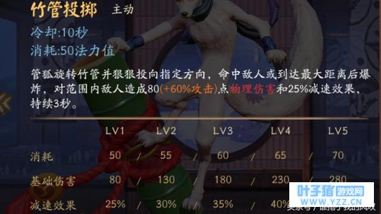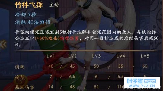 一技能—竹林飞弹:管狐向指定区域发射5枚竹管炮,每枚造成14加0.6AD加成的物理伤害,命中同一目标时后续伤害会衰减50%。管狐的主动输出技能,CD短,范围广,伤害高,耗蓝低,可以用来探视野,建议副升。