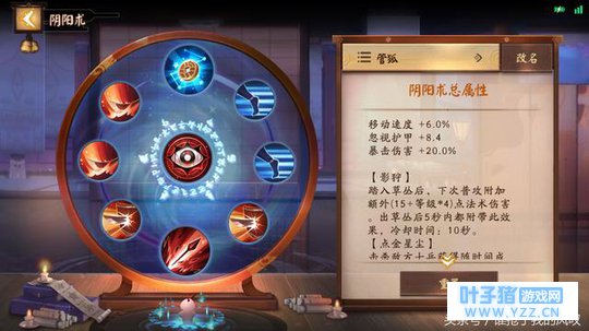 阴阳术推荐:两个移速,两个物穿,两个爆伤,阴阳术选影狩和点金星尘,秘术选豹眼。点金星尘可以加快管狐装备成型速度,毕竟对于射手来说,发育必须放在第一位,影狩和豹眼配合管狐被动可以瞬间打出超额爆发,需灵活运用。