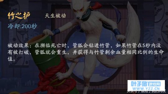天生被动—竹之护:濒死时会钻进竹筒,如果竹筒5秒内未被打破,管狐即会重生,并获得与竹筒剩余血量相同比例的生命值。自带复活技能,塔下骗反杀的神技,运用好的话会给对方突进造成很大困扰,冷却时间超长,竹筒也不是很抗打,不要离队友太远,这不是你浪的资本。