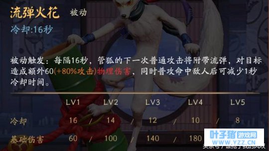 被动技能—流弹火花:每隔一段时间,管狐的普通攻击会附带60加0.8AD加成的物理伤害,普攻命中敌方单位会减少1秒冷却时间。线上骚扰对面的神技,技能刷新后切记打在敌方式神身上,前期升一级即可。