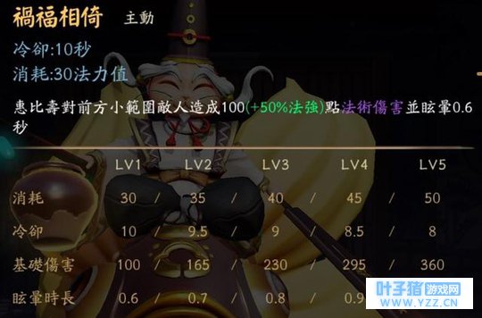 (决战平安京)英雄超级攻略之 能奶能坦又能控的万能辅助 - 惠比寿 惠比寿大家可能不熟悉,比较多人称呼他「爷爷」,也是目前版本中个人认为最强的辅助位。 一、技能 福报 被动:惠比寿每损失1%法力值增加2%法力回复。 讲解:这个被动让惠比寿在初期的法力也能有更好的续战能力。 五福临门 冷却:14/13/12/11/10秒 消耗:60/70/80/90/100法力值 惠比寿招来福气,治疗自己和周围的友方单位,每0.5秒恢复22.5/30/37.5/45/52.5(+10%法强)点生命值,持续3秒。 讲解:这招就是爷爷可以当超级奶妈的招牌技能,走到哪奶到哪,不管是前期中期还是后期,都是非常奶的技能。 愿者上钩 冷却:18/17/16/15/14秒 消耗:100法力值 惠比寿向指定位置甩出鱼竿,若命中敌方式神,则进行2次拖拽;若没有命中,则进入垂钓状态,移动和施法均可中断此状态。 再次点击收起鱼线,将命中的敌方式神拉向自己,造成120/180/240/300/360(+50%法强)点法术伤害。 讲解:这招决定了你是神爷爷还是躺分爷爷,施放有前摇动作大概0.5秒左右,需要更准确的「预判」敌人的动向,才能更准确的拉中敌人,这招可以搭配移动跟瞬步使用。 祸福相依 冷却:10/9.5/9/8.5/8秒 消耗:30/35/40/45/50法力值 惠比寿对前方小范围敌人造成100/165/230/295/360(+50%法强)点法术伤害并晕眩0.6/0.7/0.8/0.9/1.0秒。 讲解:建议起手只需要点1等,1等跟5等的晕眩时间只差了0.4秒,投资报酬率不是那麽高,最后在点满就可以。 鲤鱼旗 冷却:80/70/60秒 消耗:100法力值 惠比寿召唤幸运的鲤鱼旗,保护周围的友军式神,使进入范围的友方式神立即获得(+8%最大生命值)的治疗及淨化效果,每秒额外恢复30(+10%法强)点生命值,持续6.5秒。 讲解:这招的关键在于「淨化效果」,可以瞬间消除队友的负面状态,可以让被控制的友军瞬间解除,很像是范围更大的一技能加上拔除的效果,不过要注意施放的时机跟位置,因为鲤鱼旗是固定位置的补血效果。
