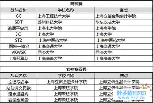 最终,经过激烈的角逐,上海赛区冠军赛名单正式揭晓。下表的八支战队与四支女神战队从海选赛中脱颖而出,他们也将在5月13日齐聚长泰广场国际文化中心,参加上海赛区的冠军之战!