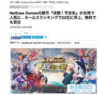 《决战!平安京》台湾免费排行榜下载排名(来源:AppAnnie) 游戏在台湾地区上线后的傲人佳绩,吸引了海外媒体的高度关注,并对《决战!平安京》的表现给予了高度的认可。