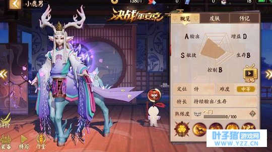 孤独的成长经历并未摧毁小鹿男的意志,他在生活的磨砺中锻炼出自强不息的品格。天生被动技能“自强”,可以让小鹿男从周围一定范围内被封印的单位身上获取力量并不断强化自己,每层都能提升一定技能伤害,但在一段时间后强化会逐渐衰减。 半身为人,半身为鹿,有着一半鹿躯体的小鹿男行动迅捷而又灵动。主动一技能“林间踏风”发动后,小鹿男在一定时间内将获得移速加成并向前奔跑,期间还会对撞到的敌人造成物理伤害与减速效果。如风吹过林间般,少年将自由的穿梭于战场中! 一技能林间踏风 主动二技能“远野之怒”是小鹿男的主要输出技能,他会持续在周围一定范围内不断引发随机爆炸,每次爆炸都对命中敌人造成一定物理伤害。在面对多个敌人时,能够凭借吸血效果为小鹿男提供可观的回复效果,增强团战中的生存能力;而面对单个敌人时,其触发机制可以使伤害集中,造成更强的单体输出,发挥收割的作用。 二技能远野之怒 作为从小在森林中长大的妖怪,小鹿男也获得了来自森林的庇佑。在面对敌人时,小鹿男将发动主动三技能“森林守护”,张开一个可吸收伤害的护盾,护盾消失后还会立刻对周围敌人造成范围伤害。在森林的守护下,小鹿男必将更加勇猛无畏! 三技能森林守护 终极技能“鹿影奔腾”是小鹿男的杀手锏,他将向指定方向发起冲击,并对途中撞到的敌人造成物理伤害并向两侧击飞,可以起到分割敌方阵型、打乱敌人站位的重要作用。黄金鹿群奔腾而来,纵使再牢固的阵型,也将被鹿群瞬间打破。 四技能鹿影奔腾 阴阳师大人们在操作小鹿男的时候,可以通过封印小兵触发天生被动技能“自强”,快速强化自己。在遇到敌人之际,可以先开启三技能“森林守护”,接着通过一技能“林间踏风”接近敌人,并使用二技能“远野之怒”对敌人造成伤害。在队友发起团战之时,寻找合适的时机和地点,使用终极技能“鹿影奔腾”打乱敌人阵型,将对手分离开来,协助队友将关键目标迅速击破,从而获取胜利。 随着全新式神小鹿男正式登陆平安京,小鹿男史诗皮肤“紫苑藤雪”也将上架服装铺,欢迎大人们进行选购!