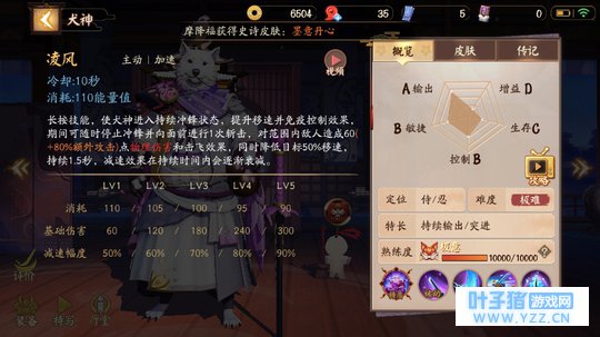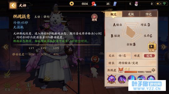 燃魂战意 犬神的究极技能,释放后可以让犬神变身为铠甲勇士,瞬间提升自身移速攻速,并且加快回复能量。可以作为先手技能来配合凌风强行开战,此技能没有什么技巧,所以就不介绍了。 重点:无脑技能,自己看着办用。