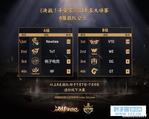 决赛席位一锤定音?八支劲旅顺利突围 6月28日—7月1日,入围积分淘汰赛的12支战队分为两组,展开了每分必争的激烈角逐。最终每组的前四名突围成功,顺利晋级决赛。淘汰赛八强分别是:Newbee、ToT、桃子电竞、RF、VTG、WE、OG、GT。