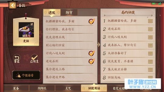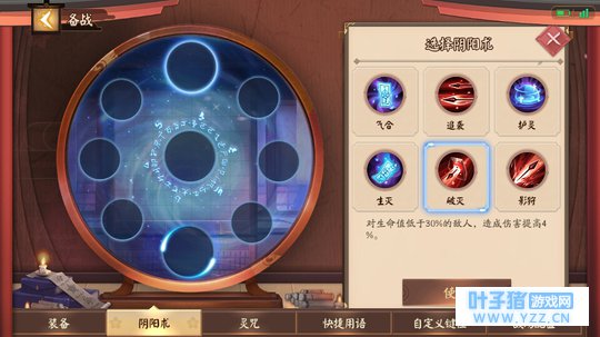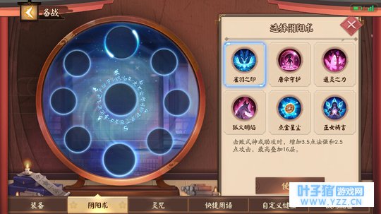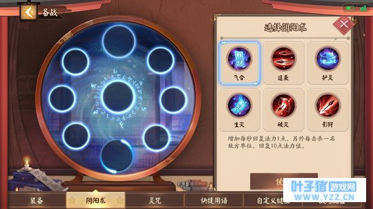 这是备战界面O_o 在备战界面里,有着六个分界面,而我们需要设置的,是装备、阴阳术、快捷用语以及自定义键位。 ––––––––––––––––––––––––––––––– 首先我们来讲讲装备设置。( •̀∀•́ )