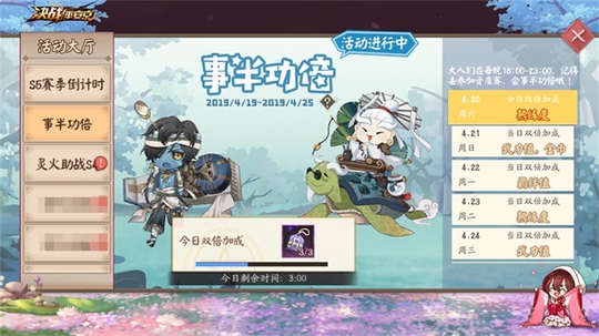 赛季专属,诚意之礼。内务组在S4赛季为大人们奉上两款别出心裁的专属皮肤,分别是授业传道愿者上钩的【惠比寿:战之仪·礼教师者】,还是孤身探险携宝而归的【跳跳哥哥:战之义·探秘大使】,助阵大人们为赛季荣誉努力拼搏。《决战!平安京》将在4月26日更新维护后将赛季皮肤奖励发放给大人们,所有满足条件的阴阳师均可以在新赛季开启后领取到这两款精美的S4赛季专属皮肤,还未达成获取条件的大人们可得抓紧最后时间冲刺奖励哦! 事半功倍 福利来袭 4月19日至4月25日期间,每晚18点到23点,阴阳师大人们在线均可自动获取“事半功倍”活动的双倍加成效果,包括金币双倍、羁绊值双倍、武力值双倍、式神熟练度双倍。同一天有两种加成效果时则同时生效。在获取加成效果之后,大人们在接下来进行的三场资质赛中,都将获得当天对应的双倍加成。除了武力值双倍加成需要“战斗胜利”条件,其余加成效果无论输赢都可生效!