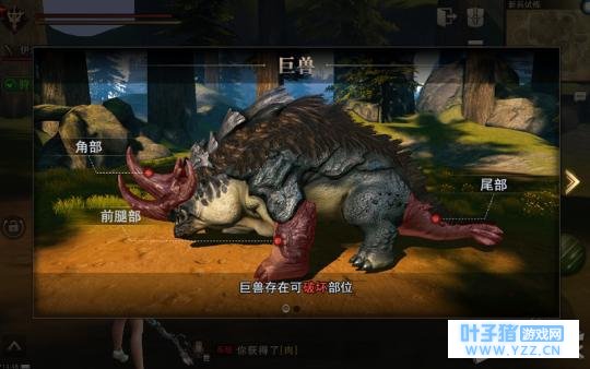 狩猎过程中抓住它们的弱点逐个击破,能大大降低捕猎难度,比如我们优先将它的腿打掉,它就会在一段时间内倒地不起,像咸鱼王一样任人宰割,打击弱点部位还能获得更多额外奖励。也会有一些任务鼓励你去打他们的重点部位,一想到能爆蛋,我就好好兴奋呢! 开启“天眼(真视模式)”后,玩家就能更明显观察到巨兽们的敏感部位以及破坏进度。这样你就可以把它们的身体都看光了。不过Boss们讨伐起来还是有一定难度的,瞄准攻击时需要把握时机,融合小走位攻击,打起来十分舒筋活血,打赢猎物后还是很有成就感的。