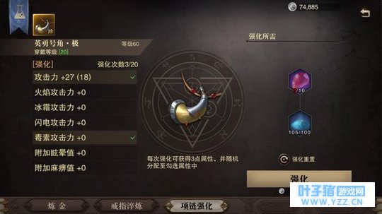 (3)元素流的优点是省钱,伤害高。 1、省钱:为什么说元素流省钱呢,这里又要说到另外一件装备“项链”,很多玩家都不知道项链是可以锁定强化属性的。如果你锁定强化攻击每次强化都需要200砖石尘、15颗魔晶石、5万银币。每次强化加3点攻击,也就是说你强化到20级有60攻击力。但是元素流就可以少锁一样属性,留攻击和你走的元素攻击,这样消耗的材料少一半,也不用去买号角。