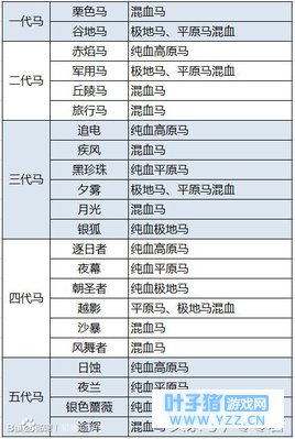 繁育次数每匹马都有自己的剩余可繁育次数,一般情况下刚刚抓住的马繁衍次数是1—2次(实际上,小编就没见过繁衍次数2次的马),每次进行繁育后会消耗一次。 繁衍次数为0的马就失去了繁衍的能力。 马匹寿命马匹会自然的消耗寿命,新出生的马匹会拥有1000点初始寿命,而野生驯化的马匹则会适量减少。 寿命可以通过消耗水晶兰进行补充(1000点/次),玩家可以在商城、市场购买、或者通过使用幸运马蹄铁在采采处兑换。(幸运马蹄铁可以在放生马匹后获取。)所以,再也不用担心自己的马会离死去了。 知道了这些,我们可以看看马匹是如何繁衍的了。 首先,繁衍马匹需要两只马是一公一母,并且都生长到了可以繁衍的“年龄”。(好像都是废话!) 其次,繁衍出来的小马的血统会受到父母两只马的影响,如果两只马都是同种的纯种马,那么生出来的小马也一定是该种类的纯种马。如果两只马是不同种的纯种马或者混血,那么小马便是混血马。 同时,小马的属性也会继承自父母两批马。所以,如果你同时想要两匹马的属性,那就让他们繁衍吧,虽然小马的属性还是会随机得到某几个。 最后,我等非酋必须要注意的是,高级马生出来的小马不一定是高级马,也有可能出现返祖现象,生出低级的马来,然后就亏死了。 一般情况下,纯种马和纯种马结合生出高级马的几率会大一些,而混血马与混血马生的小马则有很大的可能是第几马,这一点倒是与现实生活中的马匹繁殖很相似。 有兴趣养马的大佬一定要注意这一点。 那么干货来了,下面是小编找到的马匹繁衍血统表。