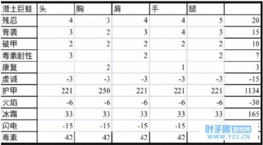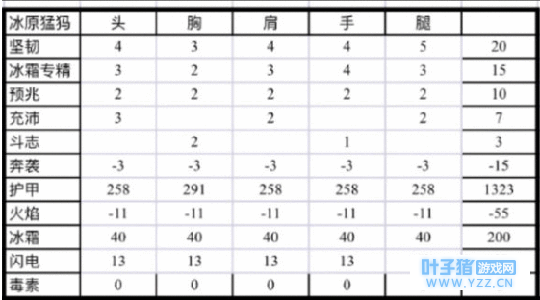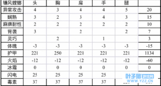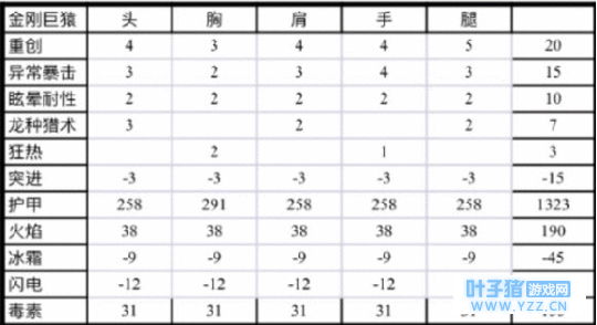 大猩猩的套装特技面板超级好看。无论是增加暴伤的重创,还是增加异常发动概率的异常暴击,眩晕耐性也是无双的抗性。从这个角度分析,平民玩家应该都制作猩猩套,然而!然而!然而!作为甲胄,大家不要忽视防御力呀!竟然有两种元素减防!开玩笑吧!冰和电,后期boss笑醒!至于负面特技,是增加进入冲锋的时间,无关痛痒的增益。