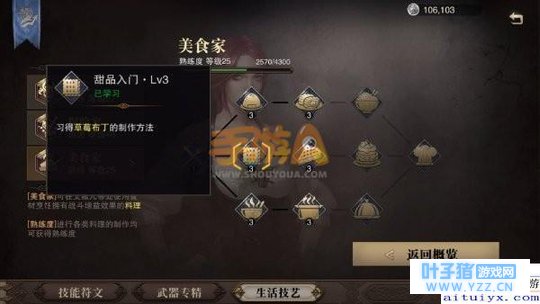 2、随着食材的收集与料理制作达成一定的熟练度可以提升大厨等级,学习到主餐(入门,熟练,精通)、菜肴(入门,熟练,精通)、甜品(入门,熟练,精通)三大项的一些更好的料理。