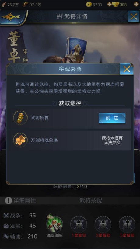 导读:在《乱世王者》中,玩家野外采集、行军作战离不开士兵,士兵的训练速度和人数直接决定着我们的实力强弱,这个时候我们便需要董卓出场辅助我们的各大兵营、提升士兵训练速度了。 【武将介绍】 董卓 武将简介 详细属性数值(初始) 性别 男性 战争 65 阵营 群雄 发展 45 品级 紫色 辅助 210 武将生平:董卓,字仲颖,陇西临洮人。献帝时权臣,官至太师,封郿侯。于灵帝末年的十常侍之乱受大将军何进之召率军进京,旋即掌控朝中大权。其为人残忍嗜杀,倒行逆施,招致群雄联合讨伐。 【武将获取方式】 1、武将招募:可以通过普通招募获取,有0.57%几率抽取到紫色武将;高级招募有4.43%几率抽取到紫色武将。 2、将魂兑换:将魂可通过兑换,购买并数以及势力据点招募获得,10个董卓将魂可以兑换得到紫色武将董卓。 【武将固有技能】 高级训练:委任在兵营和战车工坊时,士兵训练速度提高+2.2%(每100点辅助获得1.05%加成) 技能解析:与刘备不同,虽然董卓也属于辅助将,可是并不是奶妈,而是帮助我们提高士兵训练速度的,所以我们把他委任在兵营里才是最恰当的选择。 【武将技能学习推荐】 1星解锁推荐:枪兵征召——委任在步兵营时,造枪兵上限提高(辅助技能) 3星解锁推荐:枪兵训练——委任在步兵营时,造枪兵速度提高(辅助技能) 5星解锁推荐:步兵教头——委任在步兵营时,步兵训练速度提高(辅助技能) 推荐理由:董卓是一名非常适合被委任在兵营的武将,这里笔者推荐委任其在步兵营,因为我们接触到的第一名橙色神将便是张飞,他的技能对枪兵有加成,我们在前期武将不多的情况下必然以发展枪兵实力为主,所以一星技能推荐大家学习枪兵征召。 三星董卓的话,推荐大家学习枪兵训练,可以提高枪兵的训练速度,这样我们在争霸的时候才不会有无兵可用的尴尬局面。 董卓升到五星时,推荐大家选择刷出步兵教头这一辅助技能,董卓委任在步兵营时,步兵训练速度提高,十分强力,这里强烈推荐。 【总结】 董卓就是这样一个以造兵著称的武将,而枪兵则是我们的主打士兵,所以笔者这里推荐给大家的都是枪兵技能,当然大家也可以根据自己的需要搭配其他兵种技能。 了解更多相关信息,请前往http://sy.yzz.cn/ku/lswz/ [编辑:叶子猪小秘书]