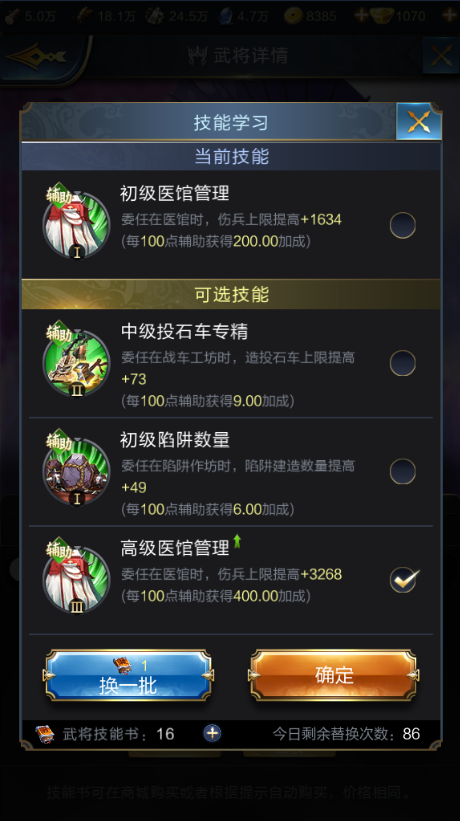 导读:在《乱世王者》中,貂蝉是通过主线任务即能获得的辅助紫将,在游戏初期甚至后期都有一定的地位。下面,就让我们全面的了解一下游戏中的貂蝉。 【武将介绍】 貂蝉 武将简介 详细属性数值(初始) 性别 女性 战争 62 类型 辅助 发展 60 品级 紫色 辅助 208 武将生平:貂蝉是王允的侍女,后成为义女,长得美貌动人,知悉王允对于董卓的乱政深感无助,于是便献出自己来对付乱臣贼子。貂蝉以美人计同时获得董卓与吕布二人的眷恋,成功挑动吕布与王允合作,刺杀董卓。 【武将获取方式】 1、主线任务:完成主线任务即可获得。 2、武将招募:高级招募获取,有4.43%几率抽取到紫色武将。普通招募无法直接获得,有5.18%几率抽取到紫色将魂。 3、将魂兑换:将魂可通过兑换,武将招募以及攻打势力据点获得,10个貂蝉将魂可以兑换得到紫色武将貂蝉。 【武将固有技能】 高级治疗:委任在医馆时,伤兵回复速度提高(每100点辅助获得1.75%加成) 技能解析:貂蝉的固有技能是高级治疗,可以提升伤兵的回复速度,大大提升了伤兵重返战场的时间。而拥有该技能的武将目前只有两个,使其成为了委任医馆的第一选择。在战时,作用非常的明显实用。 【武将技能学习推荐】 普通技能:医馆管理,委任在医馆时,伤兵上限提高(辅助技能)。 稀有技能:治疗消耗,委任在医馆时,治疗伤兵消耗降低提高(辅助技能)。 推荐解析:貂蝉一般都被认为是医馆委任的最佳人选,其高级治疗搭配医馆管理和治疗消耗,使得貂蝉委任在医馆治疗伤兵获得的加成最大化。但是由于医馆相关的技能过少,算上稀有技能也只有两个,在搭配上难免有些浪费,最后一个技能可视情况自行补足。 【总结】 貂蝉做为一名紫色武将,属性还是相当的突出的,高辅助属性配合技能治疗、医馆管理和治疗消耗使其成为医馆委任专用将。 了解更多相关信息,请前往http://sy.yzz.cn/ku/lswz/ [编辑:叶子猪小秘书]