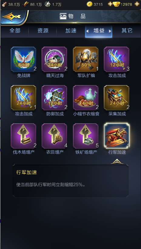 在《乱世王者》中,我们获得的道具都会统一的存放在物品(背包)里,方便我们查看和使用道具。 【背包简介】 在游戏的主界面下方,点击物品选项,即可进入物品(背包)系统了,如果有新获得的物品,物品选项这里会有红色数字显示。点开后,我们可以看到全部的道具,新获得的道具会在其左上角显示“新”的字样。 由于游戏中道具种类非常的多,游戏中又为物品(背包)进行了分类,主要分为四大类:资源、加速、增益与其它。 【物品分类】 资源:存放着在各种途径获得各级资源宝箱和各种安全资源,安全资源,顾名思义就是使用后也无法被敌人掠夺走的资源,效果和仓库保护资源相同。 加速:这里指的加速,只包括用来给城内外建筑相关的功能加速,不含出城后使用到的各种加速道具。这里的加速现有以下几种,加速、建筑加速、伤兵恢复加速、科技研究加速、部队训练加速、建造陷井加速,其中加速道可代替其它5种使用。 增益:主要是指对军队相关的增益,存放的物品都是辅助攻击或防守,降低消耗或迷惑敌人之类的道具。另外行军加速和采集加速也存放在这一分类里。 其它:以上几项无法分类的道具都存放在这里,这里的道具基本不用查看背包,直接会在相关地方显示。如兵书,升级武将页面有详细数量显示;如后裔之箭、蚩尤号角,升级箭塔和战争大厅时就会有显示。 总结,道具种类的多样性,让游戏变的更加的精采,让一场战争充满了变数,记得有空来物品(背包)看看,不要遗忘了它们。 了解更多相关信息,请前往http://sy.yzz.cn/ku/lswz/ [编辑:叶子猪小秘书]