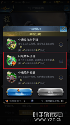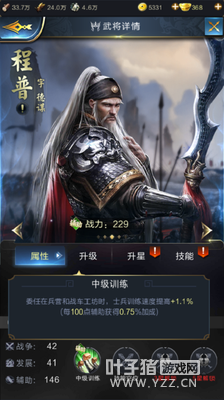 【武将固有技能】 中级训练:委任在兵营和战车工坊时,士兵训练速度提高+1.1%(每100点辅助获得0.75%加成) 技能解析:程普有着中级训练的固有技能,又有着较高的辅助属性,非常适合被委任在兵营,下面笔者就具体分析下如何利用搭配好学习技能。