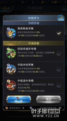 【武将技能学习推荐】 普通技能:木材采集,木材采集速度提高(发展技能);铁矿采集,铁矿采集速度提高(发展技能);宝石采集,宝石采集速度提高(发展技能);粮食采集,粮食采集速度提高(发展技能)。 稀有技能:木牛流马,部队负重提高(发展技能);统筹,采集额外掉落资源箱概率提高(发展技能)。 推荐解析:负重的大小决定你的部队每次采集的数量的多少,而统筹可以提升额外掉落资源箱的概率,两个稀有技能都是非常的推荐的。而普通技能优先选择木材采集,因为木材是缺口最大的资源,无论是建造建筑和云游商人都需要大量用到。 【总结】 [编辑:叶子猪小秘书]