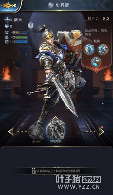 【步兵营】 类别:盾兵 攻击:★★ 血量:★★★★ 防御:★★★★★ 技能:1)“盾牌”可降低来自弓兵和弩兵的伤害; 2)“铁甲”可进一步提升盾兵的防御力; 3)“体魄”则可增强盾兵的生命值; 解析:盾兵凭着超高的防御力与血量当之无愧的成为前排“肉盾”,能够在实战前线形成一道人墙吸收伤害,从而保护后排脆皮兵种不断推进、进攻!