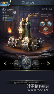 类别:攻城车 攻击:★★★★ 血量:★★★ 防御:★★★ 技能:1)“负载”可以进一步提升攻城车的载重; 2)“装甲”能够提升攻城车的防御力与生命值; 3)在进行攻城战时拥有一定的“攻城防御”; 解析:与投石车一样属于攻城必备的兵种,如果说投石车是矛的话(躲在后排进行输出),那么攻城车就是盾(顶在前线承受守城陷阱的攻击),提供有效的攻城防御力。