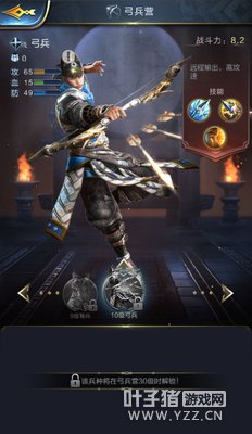 【弓兵营】 类别:弓兵 攻击:★★★★ 血量:★★★ 防御:★★★☆ 技能:1)“连击”可提升弓兵的攻击速度; 2)“穿刺”可对所有步兵以外的兵种有伤害加成; 3)“专注”可让攻击有一定几率造成额外伤害; 解析:与枪兵一样是队伍中输出主力兵种,再加上远高于其他兵种的战斗速度,使得他们在队伍的后方成为了当之无愧的战斗机器,唯一缺点是血量较低,容易被骑兵收割。