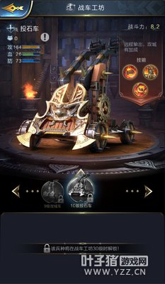 【战车工坊】 类别:投石车 攻击:★★★★★ 血量:★★★☆ 防御:★★★ 技能:1)通过使用“重击”将攻击速度减半,大幅提升攻击力; 2)“蓄力”可让投石车拥有更远的射程; 3)在进行“攻城攻击”时伤害将进一步增加; 解析:虽然投石车拥有着绝高的伤害,但攻击速度极慢,一般来说只推荐在攻城战中进行使用(不适宜攻击移动中的目标)。