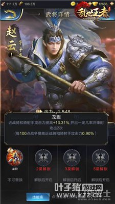 乱世王者武将培养有哪些技巧?小伙伴们要想在这片乱世之中夺得一席之地,就要快速提升实力,而武将的培养是我们提升实力的重要因素,下面小编就带大家一起去看一下乱世王者武将培养攻略! 【提升实力的重要途径 武将玩法专题介绍】 武将一共分为绿色品质,蓝色品质,紫色品质,以及橙色品质。橙色品质的武将实力较强,不过获取难度大,目前仅仅通过几率性的高级招募以及活动和礼包才能获取。 对于各位普通的小伙伴而言,我个人觉得其实在前期消耗大量元宝进行高级招募有点过于奢侈,在前期的经济发展中拥有紫色武将就足以应对当前的战争局面。战争类武将马超以及辅助类武将貂蝉通过主线任务即可获得,相信很多小伙伴们都和我相同,选择这两位初始武将作为个人前期的战场主力,一分钱都没有浪费,是不是太机智了呢? 【武将属性与技能招式究竟有何作用】 赵云不仅拥有着卓越的战争相关的属性,我们还能够为其打造一些不同的技能,可以通过技能研究抽奖去获得一些较为稀有的相关技能。从技能介绍来看,相信很多小伙伴都和我一样感受到“龙胆”这个技能的厉害之处,肯定会在战场上有非常显著的表现。 当小伙伴们点击武将的详细信息后,就会发现在技能的右侧还有三个可供挖掘的技能槽,这到底应该如何解锁呢?我花费了一番时间后终于了解到,原来是需要武将达到更高的等级与才能解锁,分别是20,60,100级方可逐步解锁空的技能槽来供我们去搭配。同时提升星级还可以有助于我们提升技能的等级,武将技能可以升级到40级,需要消耗技能丹获得技能经验,等级上限和武将星级绑定,分别是10,20,30,35,40级,分布对应1到5星,有效提升星级让我们的爱将更为凶悍。 如何提升武将星级呢?各位君主千万不要着急~不要慌乱~下面就让我们看下这些武将如何升星吧! 【获得将魂进行升星 提升实力的重要途径】 武将升星时需要消耗当前武将的一定将魂数量,而将魂最主要的获得方式就是通过“点将台”的武将招募玩法。无论是普通招募还是高级招募,获得的将魂数量都是非常可观的。而我通过一番游戏体验后发现,非常实用的紫色品质武将将魂在普通招募中居然也能够获得,这无疑是各位君主的一大福音。为什么要这样说呢?因为普通招募在一定的意义上说相当于免费,每日都可以进行免费招募获得奖励。这种天上掉馅饼的好事每日千万忘记领取呦!(不要怪我没有提醒大家哦!) 【通过技能研究玩法获取强力的武将技能】 个人费劲了一番辛苦后终于将武将成功升星,这个过程其实也是非常漫长的,毕竟也会获得许多并不需要的武将将魂。要是能按照自己的心愿进行招募就好啦!当然这是不可能的,所以我们想想就好! 将武将升星之后,可以随着我们的等级与星级的提升来提高相应的技能等级。同时要想获得更多的技能选择,小伙伴们依然要来到“点将台”这座基础设施中,点击“技能研究”按钮即可来到上图所示的页面。每日依然可以依靠免费研究获得技能丹,武将技能碎片等多种实用性道具。我个人比较喜欢10连抽的方式,毕竟必得武将技能,而在单次抽取的情况下,所获得的技能碎片种类繁多,很难获得或者合成到单一的技能招式。如果金币数量足够的情况下,小伙伴们不妨来一发10连抽看看自己的运气究竟如何吧! 【技能库页面一览】 在“技能研究”中获得到的全部技能碎片将会保存在我们的技能库之中。这些技能和武将玩法相同,依旧分为战争,发展,辅助三大类型,对我们的帮助效果还是比较大的,这也是提升战力的重要方法之一哦! 【将额外学习的技能搭配在你喜欢的武将上】 在这之后,大家就可以将获得的技能招式提供给对应类型的武将进行学习。上图所示的就是我通过“技能研究”获得的盾兵攻击技能,能够额外提升盾兵0.36%的攻击力。各位小伙伴可能会有疑问,这么少的加成效果有什么用途呢? [编辑:叶子猪小秘书]