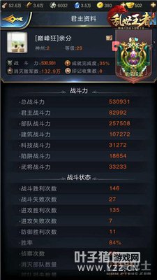 乱世王者怎么识破瞒天过海?瞒天过海是使用频率最高的战争道具,其作用是无法让敌人无法侦查我们的兵力情况,但是敌方使用了这个道具我们要怎样去识破呢?下面小编就带大家一起去看一下乱世王者识破敌方瞒天过海的技巧! 【君主战力数值】 首先我们可以点查看其君主的战斗力,用其总战力减去君主战力,打个比方假如敌方君主是在30级左右其战力一般在9W左右,我们就可以在敌方总战力减去君主的战力之后来推算出他大概的实力。 【建筑战力数值】 建筑战力是一个固定的数值,我们可以通过敌方王城的等级来推算出其建筑群的战力,假如敌方王城市16级那么他建筑群应该就在10W左右,我们在对方总战力减去建筑群的战力,就能算出其兵力的大概情况。 【武将战力数值】 接下来就是就是武将的战力,需要注意的是地方守城部队的武将只有2名,所以不必担心对方武将的数量组成的战力。