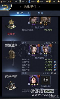 《乱世王者》手游到了19城之后,需要的资源越来越多,光靠种田基本已经无法满足日常所需,那么怎么才能快速有效的获得资源呢?下面小编就为玩家带来《乱世王者》手游资源田分配技巧,一起来看看吧。 资源田分配技巧 1.武将委任 首先武将的委任是资源开拓的第一步,小编建议选择杨修,杨修是乱世王者中的一位资源生产的小助手,把他委任在水车当中可以大大提供主攻的资源生产。 2.攻打黄巾军 攻打黄巾军是获取资源数量只是一般,但是却可以获得其他渠道难以获得的加速道具,和君主经验卷,打开黄巾军头巾有50%左右概率开出500的经验卷,加上10级黄巾军本身的480经验,5点体力大概能获得750点经验,由此可见,假如主公急着升级,可以多多镇 压黄巾军,经验虽然不多,但是也是一份收入!最后各位主公应该尽量击杀等级高的黄巾军,因为高级黄巾军经验更多,掉落的也是中级高级张角试炼卷。 3.资源分配 满医院满兵营,满医院是为了防止不死兵,再来就是1宝石1铁矿,然后种田和木材可以随机分配。 4.采集 每天出去采集八级的农田或者木材,争取多采集点 [编辑:叶子猪小秘书]