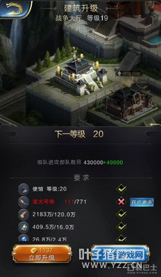 战争大厅是《乱世王者》手游中一个非常重要的建筑,它的主要作用就是召集盟友来组成队伍,用更多的军队数量去压倒敌人。 【建造与升级】 建造战争大厅需要300木材和王城等级7级,如果玩家想要建造战争大厅,满足这两个条件即可。战争大厅的初始位置只能在最靠近王城建筑的4块空地上建造,建造完成以后,可以在战争大厅的“详情”功能中,点击建筑移动,进行移动转换位置。 战争大厅等级受到使馆的限制,升级时不仅需要各种资源,还需要用到“蚩尤号角”这个道具。“蚩尤号角”可以通过各种活动或攻打野外敌兵获取,也可以直接用元宝或金币购买。 【功能详解】 首先点击战争大厅,会弹出三个按钮,依次是“详情”、“升级”、“联盟战争”。 详情: 可以查看升级建筑等级提升的战斗力与集结部队数目信息。 升级: 点击升级,可以提升战争大厅的等级。不仅需要各项资源达到要求,还需要用到“蚩尤号角”这个道具。升级的等级越高需要的资源和“蚩尤号角”的数量越多。蚩尤号角”可以通过各种活动或攻打野外敌兵获取,也可以直接用元宝或金币购买。 联盟战争: 点击联盟战争,可以查看到所在联盟当前正在进行的所有战争信息。而里面的战争记录,可以查看到所在联盟之前发生的攻防战争。继续勾选“只显示可反击记录”,会在列表后方出现“反击”选项。 【各级战争大厅的数据】