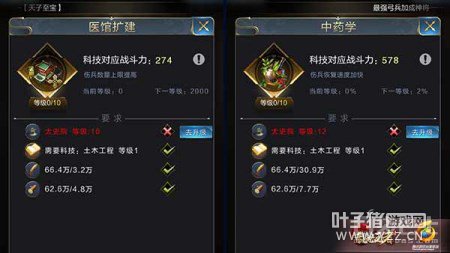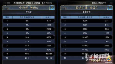 中期处于一个过度的阶段,玩家这时候既要弥补以前的不足又要为后期的发展做准备。到了中期玩家刷野、征战的以及采集的频率增加,较前期伤兵数量将更多治疗频率也会随之提高。单一的医馆升级是远远不够的,本章将告诉玩家如何利用科技达到医馆最大的效能。 【于错综复杂处寻柳暗花明】 研究科技路线:医馆扩建5级 、中药学5级交叉升级。 由于医馆扩建需要约6个小时、中药学平均需要4个小时。玩家在白天上线时先研究中药学4个小时后上线研究医馆扩建。重复两次,晚上临睡时再上线研究一次医馆扩建。这期间玩家不用一直在线,只需要计算好时间上线进行研究即可。如此一天间可以研究医馆扩建至3级、中药学至2级。最多3天便可以完成科技的研究。 【起承转合,实力超前】 玩家在中期时医馆如果已经升级至15级左右那么这个医馆就已经有了7500的容量。医馆扩建至5级后将提高至10000相当于一个20级的医馆不仅节约了资源也为后期做了充分的准备。这样玩家便可以在中后期重点研究兵法科技提高战力。中药学将为伤兵的恢复速度加成10%点,玩家将在最短的时间内重整军队进行下一次的征战或攻击高级野外敌兵获得更多的物资并促进战力的提升。 【弥补不足,再续经典】 在研究科技的这段期间玩家会得到足够的医馆治疗,但是由于军队的战力没有得到提升会导致刷野、征战的效率大打折扣,造成不必要的伤病损失。玩家这时可以利用升级所带来的技能点对军队士兵的攻击力进行加成。比如刷野玩家主要攻击力在骑兵我们便可以发展骑兵攻击天赋至2点;剩下的2点玩家可以发展步兵防御天赋强大前排,为后排争取更多的输出时间、增大胜利的概率。 [编辑:叶子猪小秘书]