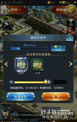 在游戏中,玩家可以自己建立联盟或者加入别的玩家的联盟。而加入联盟以后就可以呼叫盟友帮忙加速建造建筑了。只要是建筑未完成,建筑的头上便有个求助标记,只要点击就可以呼唤盟友了,让盟友来帮忙建造了。 在游戏中加速道具种类很多,自然包含了建筑建造加速。在使用建筑加速时候要注意到,普通玩家是7分钟免费加速时间,也就是说加速到还剩下7分钟以上就可以不用加速了,以避免浪费。在游戏中1金币大约能降低2分钟的建造时间,在大家赶时间的时候可以使用金币直接加速建造,赢得先机!这里推荐兵营可以适当加速提升等级,花费少量金币获得很强力的军队。另外王城升级需求的建筑也可以考虑使用金币或者道具快速升级。 以上就是18183小编乱世王者的相关攻略,更多关于乱世王者的资讯动态请关注18183手游第一门户,叶子猪小编将在您的游戏道路上为您保驾护航。 [编辑:叶子猪小秘书]