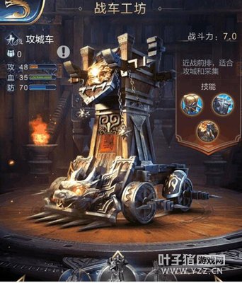 战车工坊在的战车在乱世王者中属于万金油兵种,闲时放牛采集,来往如麻,战时作攻城尖刀,一肉一输出。表面上攻城车前端拥有攻城槌,身宽体胖,利用动能冲城,和用高度和坚甲掩护其上或其后弓箭手攒射;投石车则带有杠杆装置,利用人力以及杠杆原理将数十绳子系牢的石筐中石头射出,象棋上的炮则为投石车的简称。  它们的两个的技能截然不同,所以我们先从技能上来看看他们。