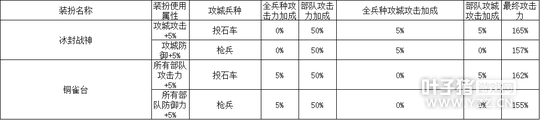 我们都知道寒冷北国的士兵将士多高壮威猛,冰封之下的战争之神,是不是也会让敌人心惊胆寒? 冰封战神的效果 使用属性: 攻城攻击+5% 攻城防御+5% 拥有属性: 出征上限+10000 什么是攻城攻击及攻城防御呢? 以实际的例子来解释吧 先来列个公式: 最终攻击力=(100%+全兵种攻击力加成+部队攻击力加成)*(100%+全兵种攻城攻击加成+部队攻城攻击加成) 我们假设变量为兵种(投石车、枪兵)及装扮(冰封战神、铜雀台),武将都带有枪兵攻击和投石车攻击,加成50%: