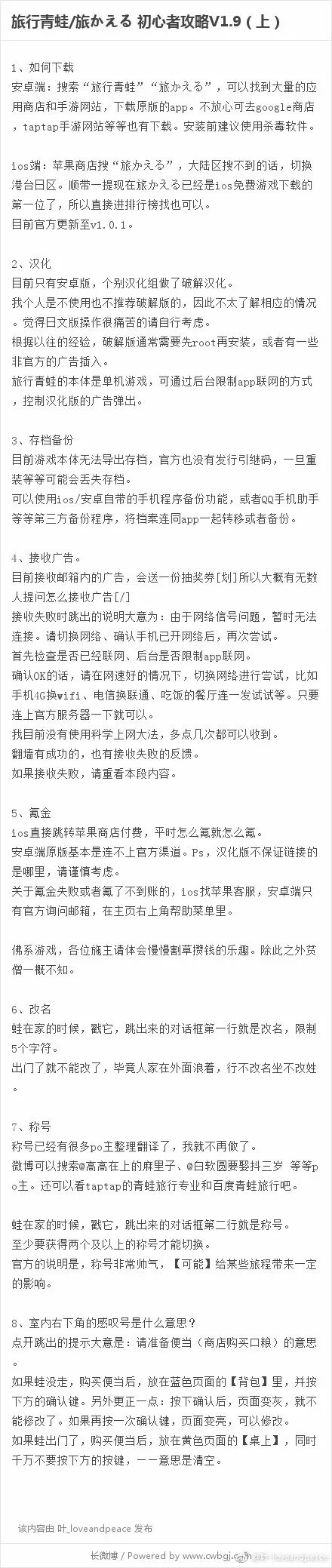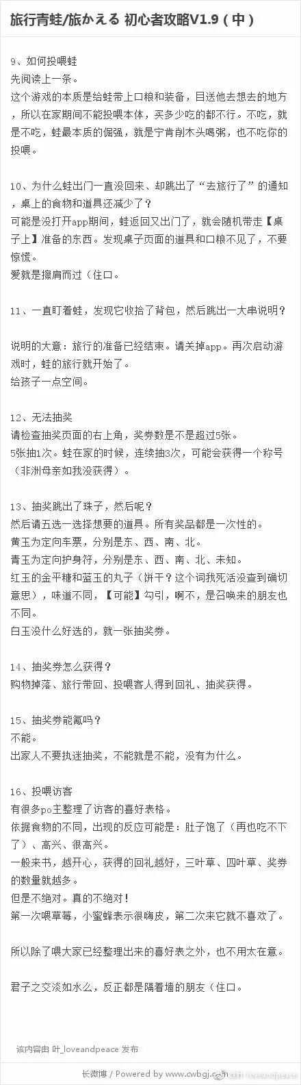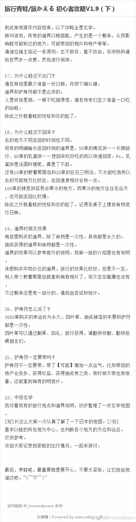 你从没见过的,最最最最最完整的游戏攻略~ 欢迎收看CCXV-7农业频道特别节目 养呱场实习生为您带来的攻略 V1.9 又名《儿行千里母担忧》《儿子今天不回家》《儿子怎么还不出去浪》连续剧 上次随手整理的非常粗糙的汉化攻略 得到了这么多饲(亲)养(妈)员的喜爱 呱也是惊了个呆 这次主要是整合了近一周收到的各种提问 对上次不准确的地方做一点修正 以及个人猜测的景点对应道具列表 仅供参考,欢迎讨论 如果没有什么疑问的话,直接看P3-5就OK啦 请在看过攻略 v1.5 的前提下进行阅读
