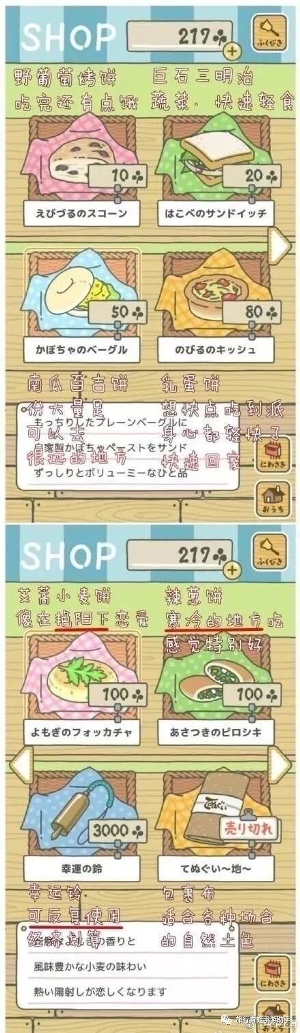 5、商店有便当和道具卖,玩家可以用三叶草购买。不同的便当也道具价格不一样,不同的便当和道具组合在一起,也会决定了你的青蛙儿子每次旅行地点和遭遇的不同。