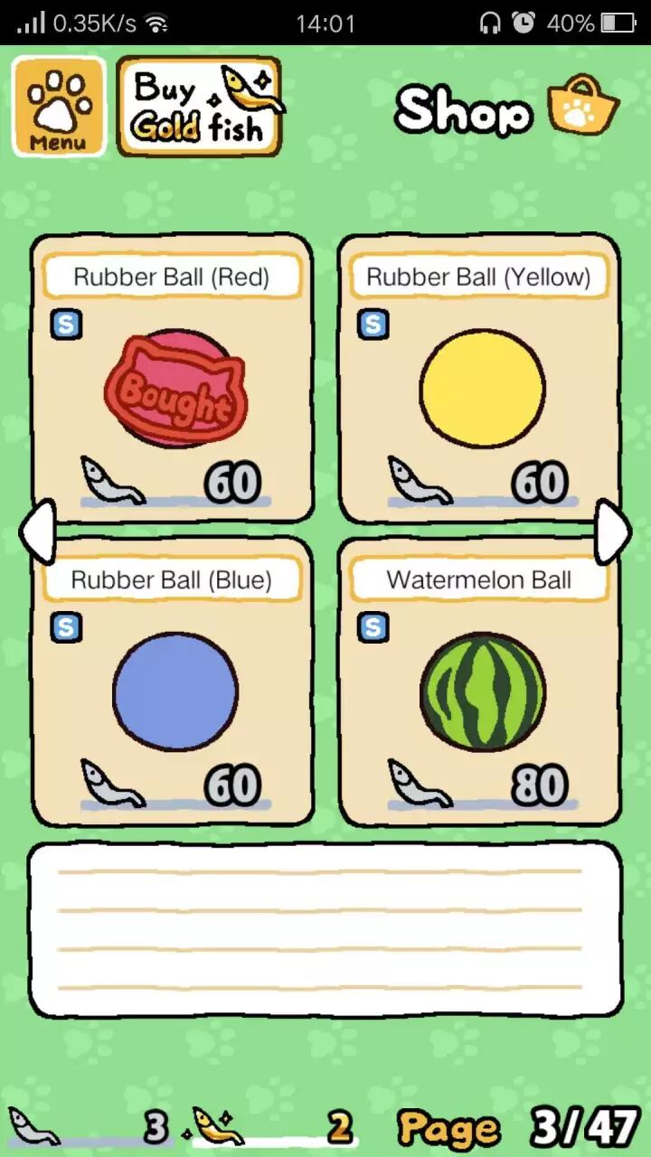 阿婆买了小红球和猫粮,先是吸引了“白兔子”,后面又撩到了“汪汪酱”,在每一次替换玩具的时候,猫咪是会留下小鱼干作为回礼的哟~超级有爱呀汪汪酱~~~o(≧v≦)o~~还可以给他们拍照,收集图鉴,目前总共有62种猫咪!!可以尽情吸猫!!大口吸猫!!