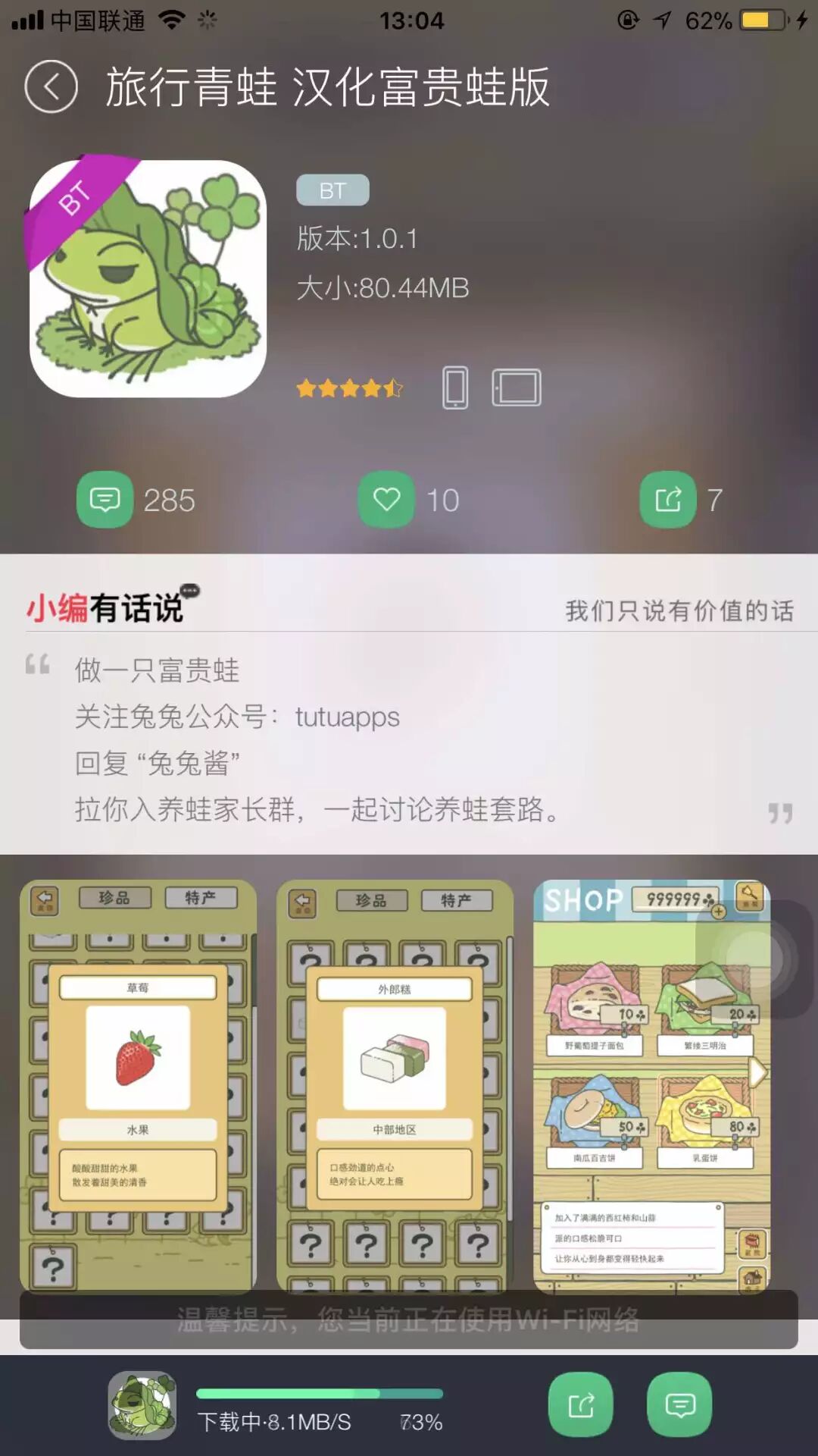 经过呱的多方打听 呕心沥血之后 今天,终于可以为大家带来IOS的汉化版本了 当然,官方目前还没有许可汉化版本 是国内的一家游戏汉化小组做的汉化版 淘宝和网上流传的均为此版本 另:苹果商店里面除了“ 旅かえる” 以外的旅行青蛙游戏都是假的 实际内容是另一款游戏 请大家不要上当