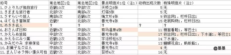 注1: 所有称号收到的明信片最多的是关于草丛和树枝,所以只列出了景点类的明信片 注2: 因为官方稀有图片文件夹中包括了下水道,铁丝网,栏杆日出,橱窗看鞋这4类,因此计入特殊明信片 注3: 中部和近畿地区属于较近地区,北部和南部地区属于较远地区